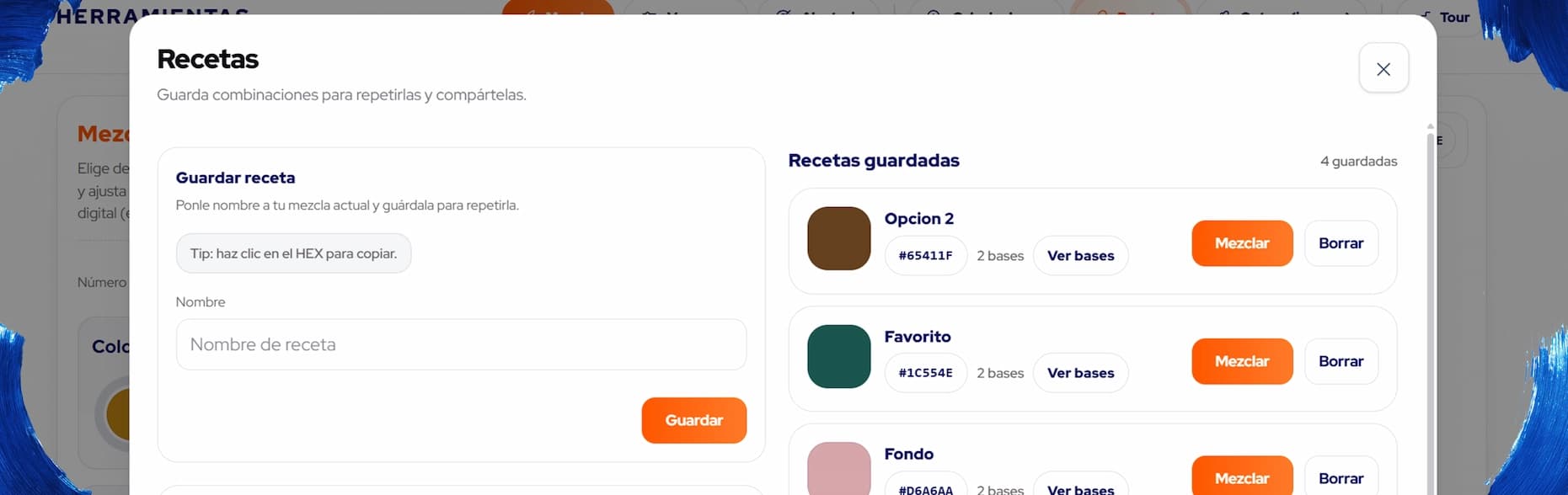 TipGuarda recetas para reproducibilidad. Si quieres igualar un color (muestra física), usa Calcular bases como punto de partida y ajusta visualmente.