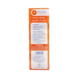 Estuche Politec con 12 frascos de 10 ml cada uno, contiene los colores básicos y 1 pincel. Es ideal para trabajos escolares, artesanías, carteles, manualidades, entre otros. Pintura indelebles y solubles al agua antes de secar Colores incluidos: blanco de titanio,negro intenso,sombra café,limón hanza,naranja,verde claro,azul celeste,rojo,azul pastel,amarillo claro,morado