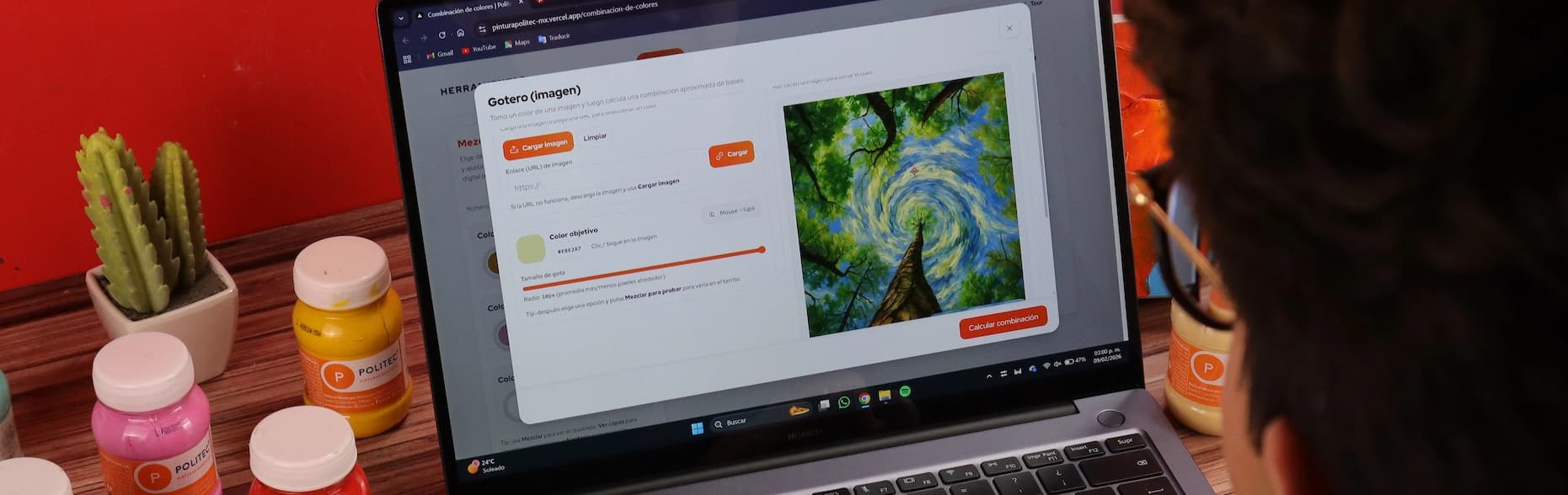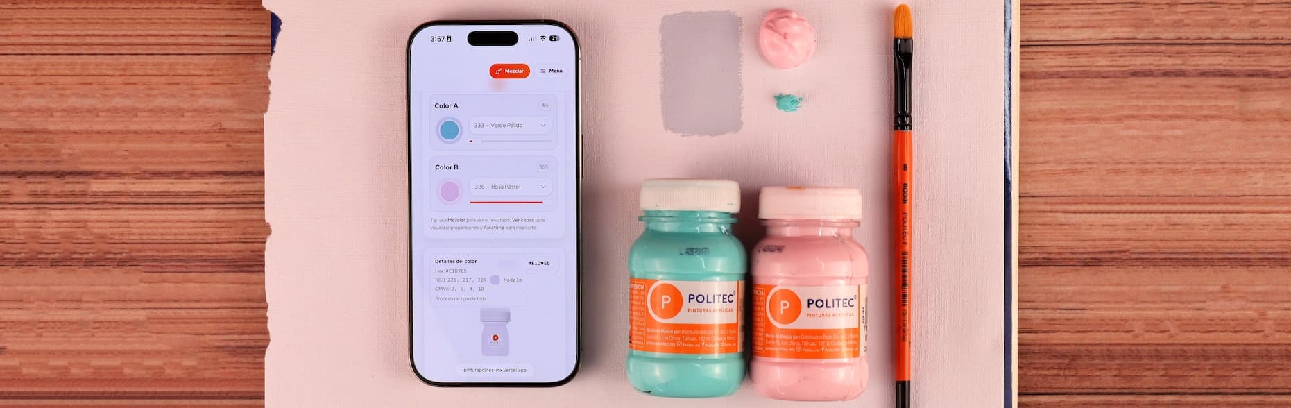 Elige tus colores base de Politec Linea 300 Clásica, ajusta porcentajes y guarda tus recetas. Úsalo como referencia para planear mezclas antes de pintar.